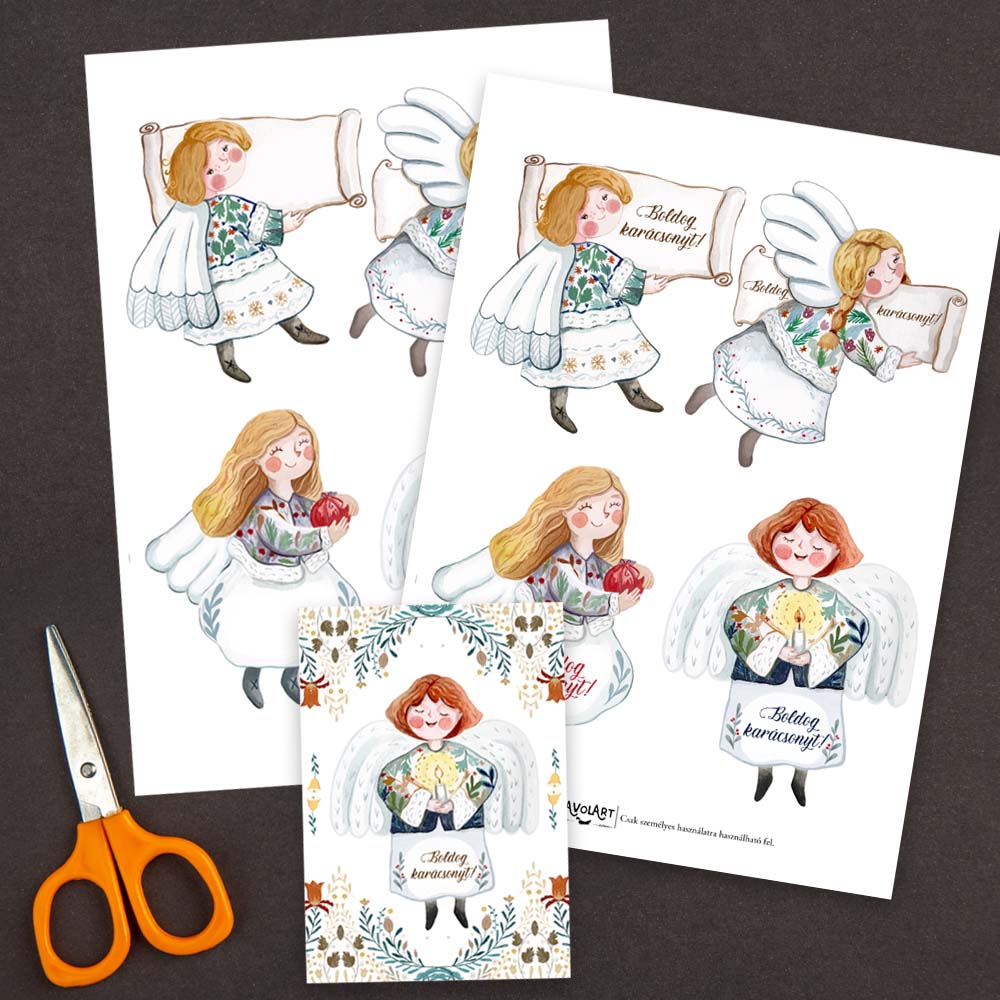 Nyomtasd ki vastagabb papírra a jobb tartás érdekében, majd vágd ki, és rögzítsd az ajándékokra. Tegyél a hátukra fapálcikát, vagy fűzd fel szalagra. A csomagban 1 képeslap és 4 angyalka található, amelyekre ráírhatod, kinek szánod az ajándékot.